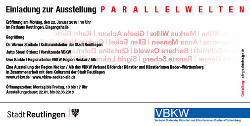 22. Januar 2018 Parallelwelten EINLADUNG Eröffnung 22. Januar 2018 um 18:00 Uhr Ausstellung im Rathaus Foyer Reutlingen des VBKW Region Neckar/Alb in Zusammenarbeit mit dem Kulturamt der Stadt Reutlingen Eröffnung Presse GEA 24.1.2018 von Armin Knauer Einladung Parallelwelten_Einladung EK_Parallelwelten_screen_pdf-down.pdf Adobe Acrobat Dokument 334.0 KB Download tagPlaceholderTags: Kommentar schreiben Kommentare: 0